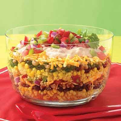 Layer half of the. Cornbread and beans over a bed of lettuce. In a small bowl mix mayonnaise.